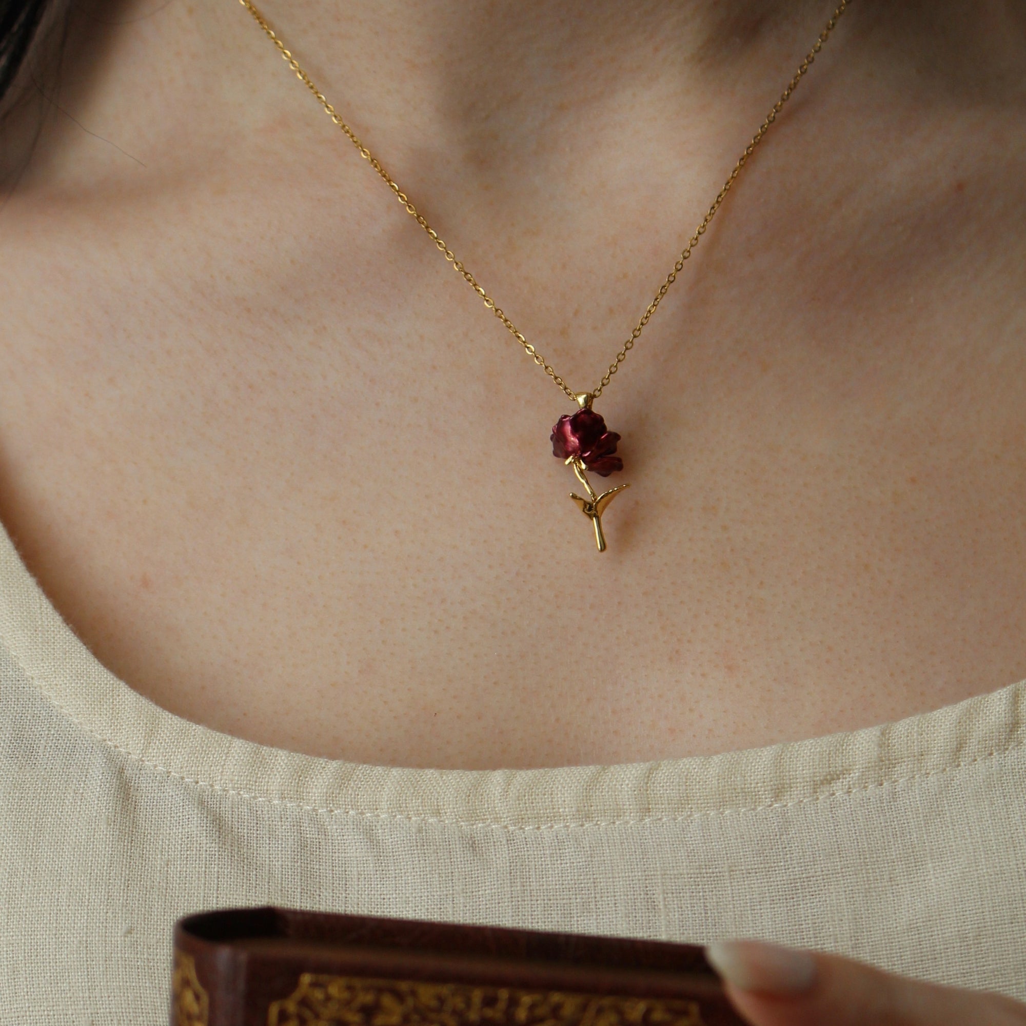 The pendant showcases intricate details, from the delicate red enamel petals to the slender stem and intricate leaves, all whilst maintaining a luxurious golden sheen. Suspended from a sleek, minimalist chain, this piece strikes a perfect balance between fairy tale enchantment and modern elegance, making it the ideal companion to our "Beauty and the Beast" book crossbody bag.