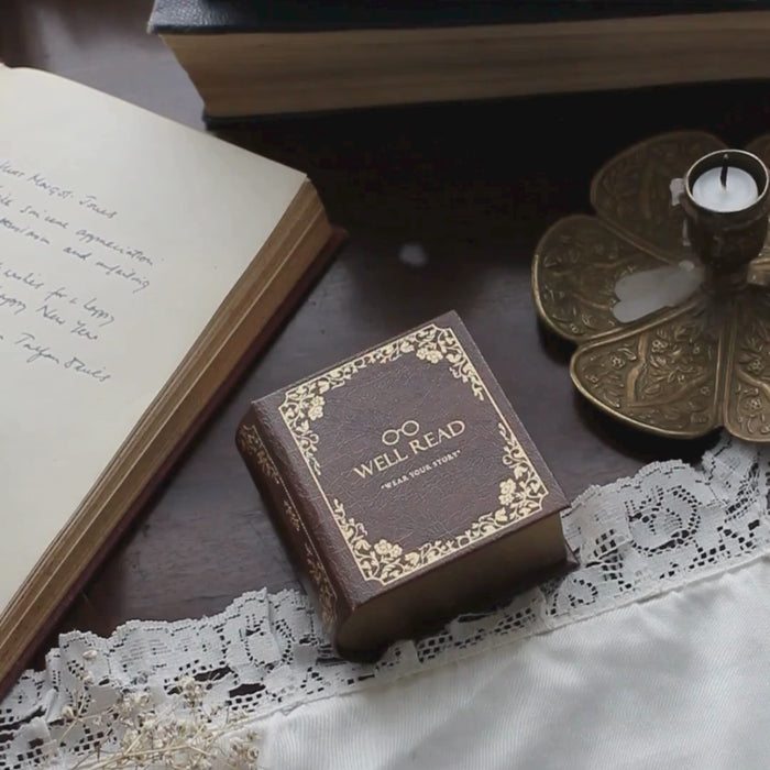 This charming, book-shaped jewellery box is the perfect home for your bookish necklaces. Its vintage-inspired design protects your jewellery and serves as a decorative piece. The luxurious velvet interior keeps your necklace tangle-free, whilst the exterior resembles a classic novel with intricate gold detailing. An ideal gift for book lovers and jewellery enthusiasts alike.