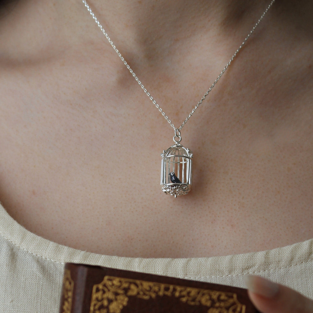 Introducing our Jane Eyre–inspired silver birdcage pendant necklace, a romantic homage to Charlotte Brontë’s classic. This delicate piece features a finely wrought silver cage cradling a tiny blue enamel painted bird—an elegant nod to Jane’s famous declaration, “I am no bird; and no net ensnares me.”
