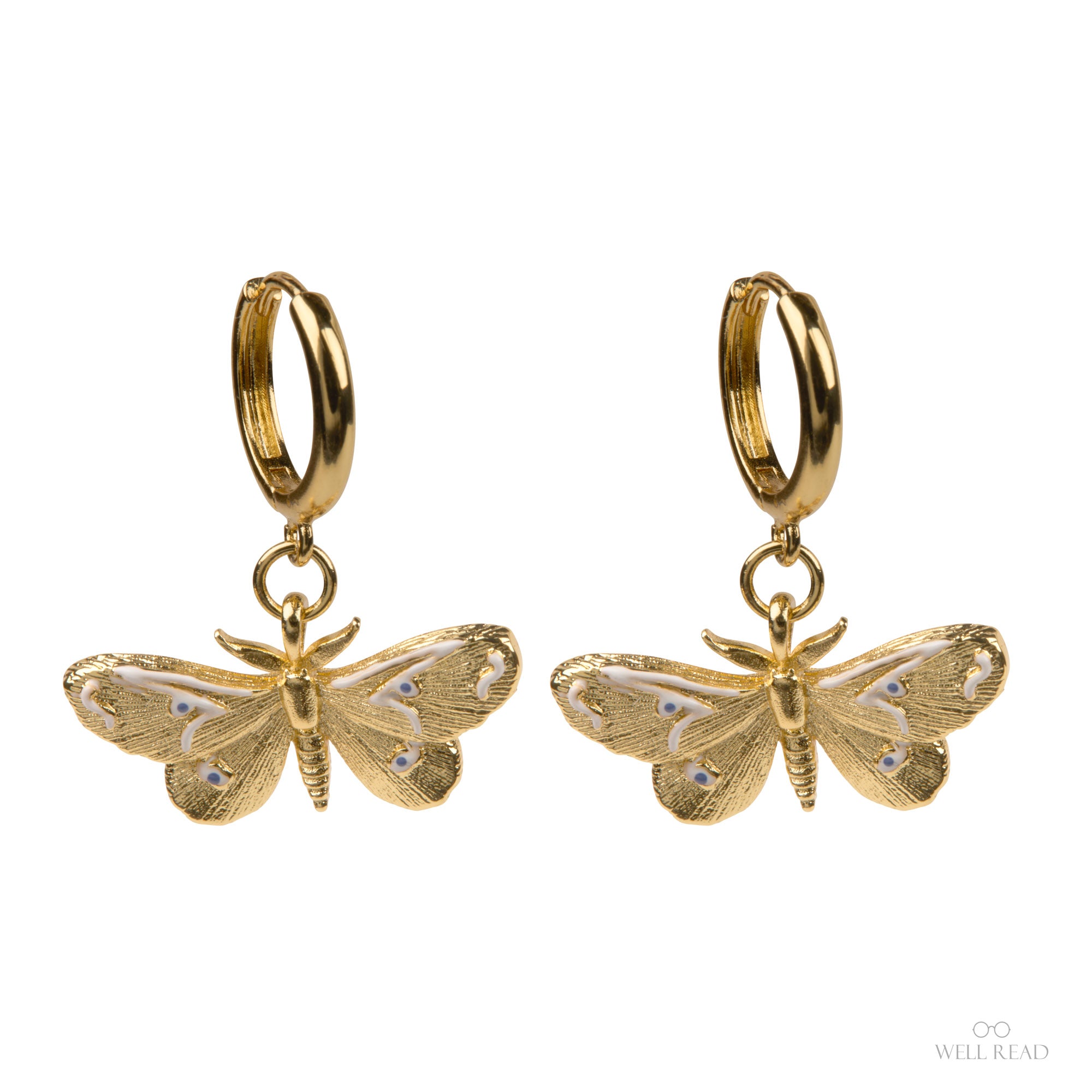 Discover the magic of our Moths and Butterflies gold hoop earrings—a delicate homage to Mary C. Dickerson’s classic field guide of the same title. Inspired by the intricate patterns, delicate wings, and ethereal beauty of the insect world, this pair celebrates the fascinating realm of moths and butterflies that Dickerson so lovingly documented.