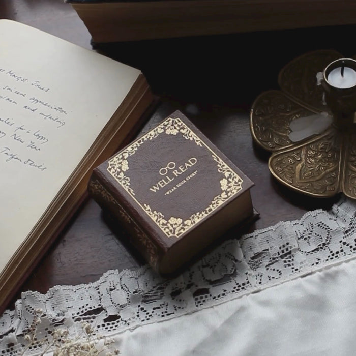 This charming, book-shaped jewellery box is the perfect home for your bookish necklaces. Its vintage-inspired design protects your jewellery and serves as a decorative piece. The luxurious velvet interior keeps your necklace tangle-free, whilst the exterior resembles a classic novel with intricate gold detailing. An ideal gift for book lovers and jewellery enthusiasts alike.