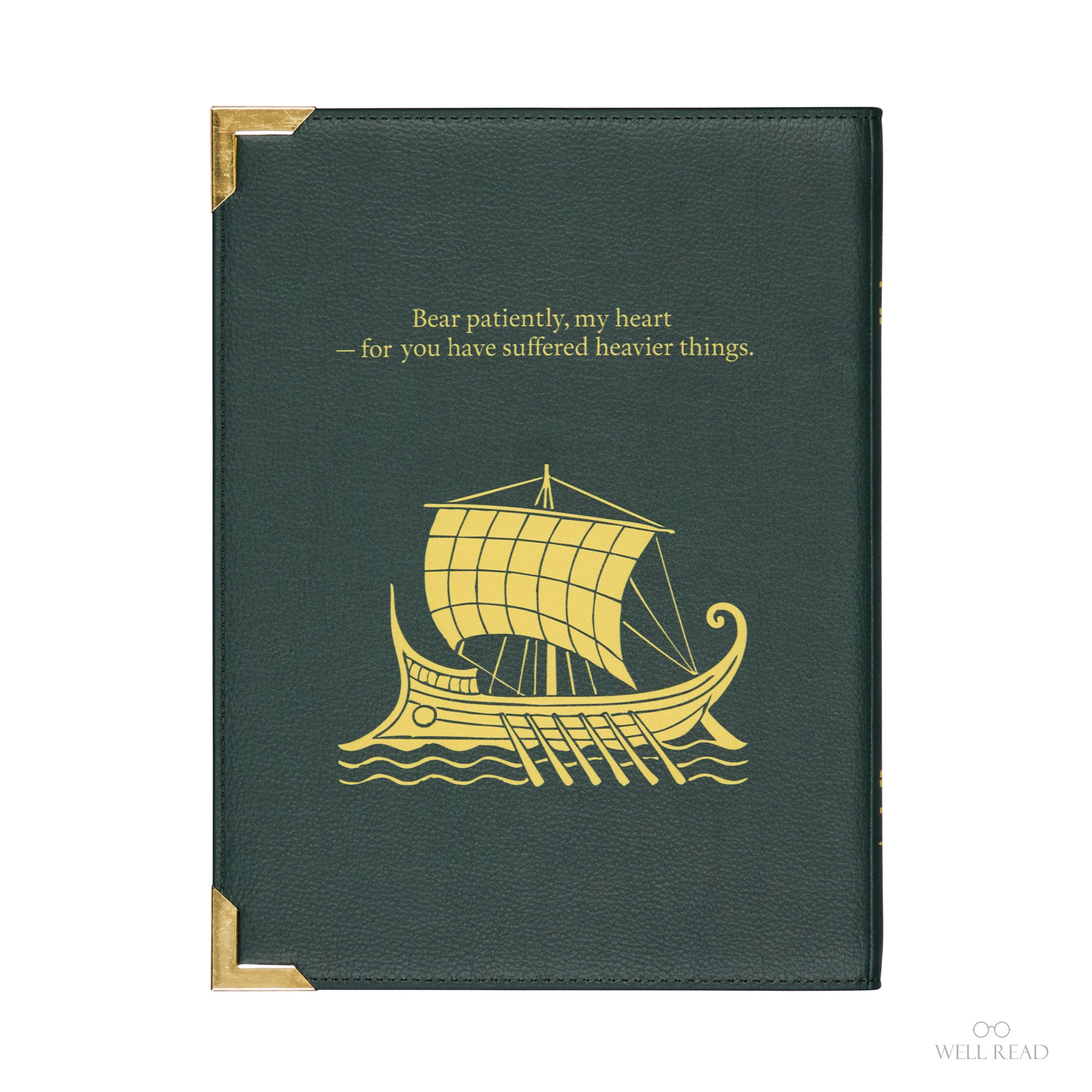 Set sail for epic adventures with our Homer’s Odyssey book bag. Cloaked in deep olive with antique-gold accents, this design echoes a gilded clothbound classic: a laurel-crowned title, lyre crest, and Penelope at her loom adorns the front of the bag. It features a handsome vertical spine with ornamental bands; and the back of the bag features a golden trireme with the steadying quote, “Bear patiently, my heart— for you have suffered heavier things.” Rich Greek-key borders and olive branches complete the timeless, dark-academia look. Perfect for classicists, myth lovers, and anyone whose heart longs for heroic journeys.