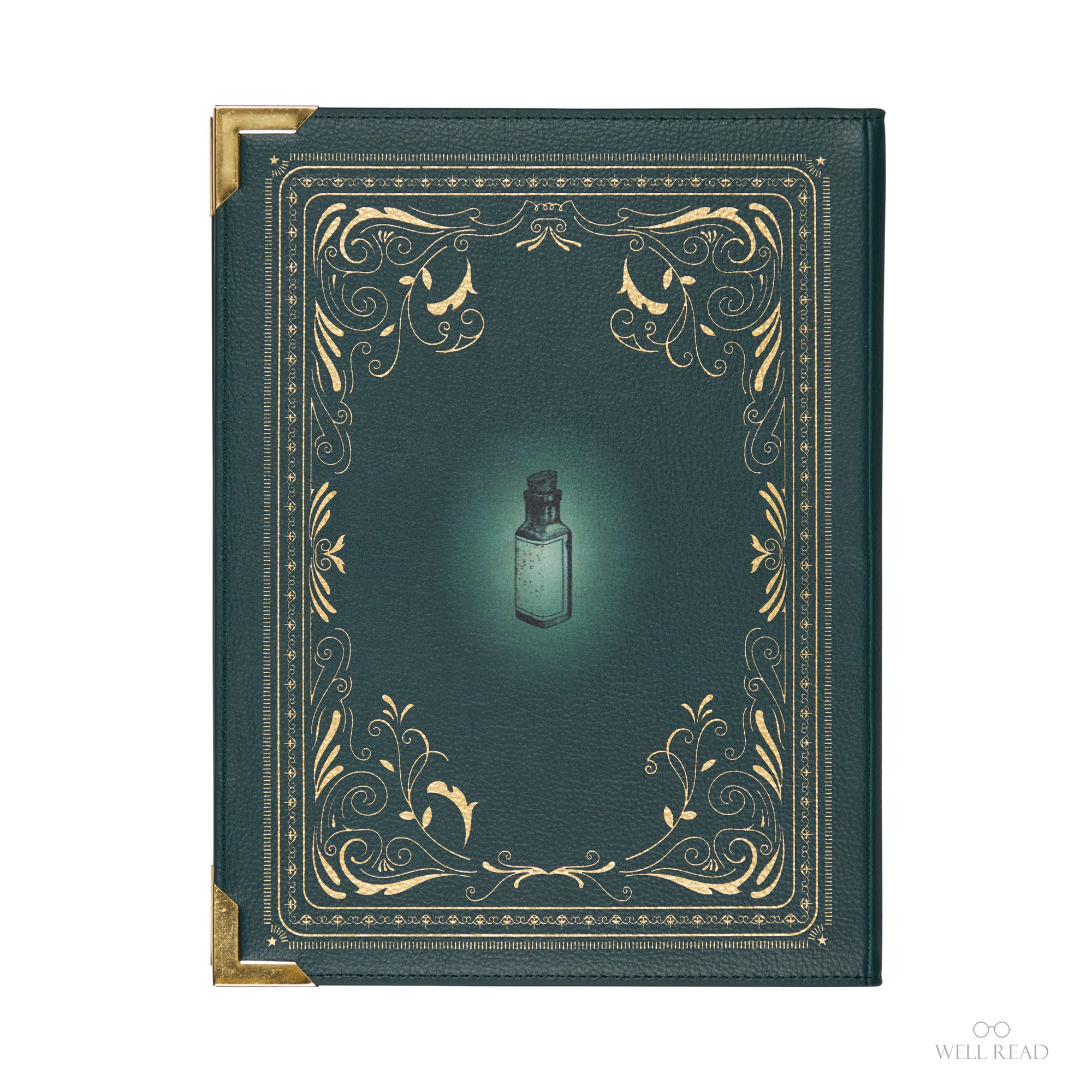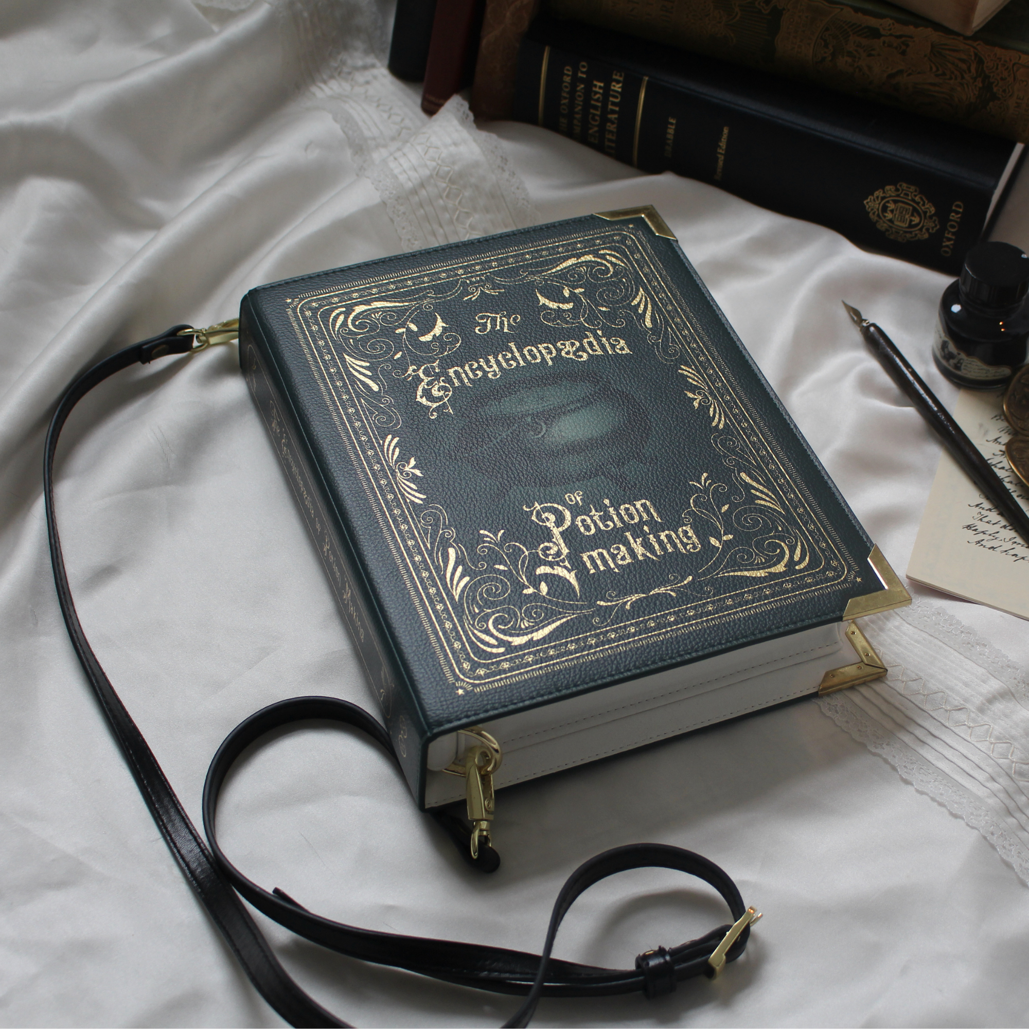 Step into the enchanting world of potion making with our striking luxury gold foiled The Encyclopedia of Potion Making vegan leather handbag, a premium elevated version of our classic printed design. Inspired by magical texts of old, this luxurious edition features the same ornate cauldron illustration but with exquisite gold foil detailing that shimmers elegantly in the light. The handbag showcases intricate gold detailing on a rich dark green backdrop, with a central illustration of a cauldron, perfectly capturing the old-world, mystical essence of potion making. The back displays an elegant illustration of a potion vessel bottle, adding to its apothecary allure. Whether you're dressing up for a formal occasion or simply going about your everyday routine, this premium bag is sure to add a unique, sophisticated touch to your outfit, perfect for those whose hearts belong to the magical world of literature.