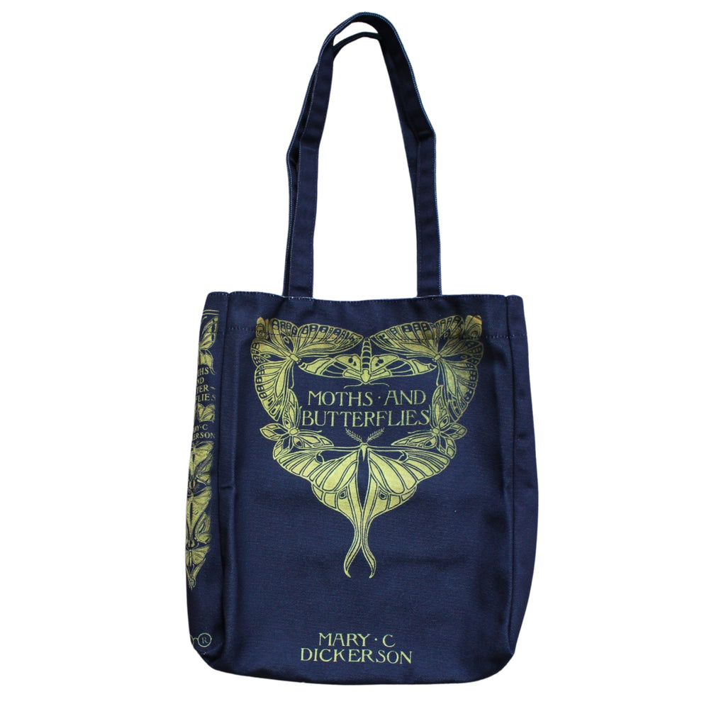 Celebrate the beauty of the natural world with this striking Moths and Butterflies tote bag. Inspired by Mary C. Dickerson's book Moths and Butterflies, published in the early 20th century, this tote features a beautiful gold butterfly design against a navy backdrop. Dickerson was a prominent naturalist known for her contributions to the study of reptiles and amphibians, and this book is notable for its detailed study of moths and butterflies, blending scientific rigour with accessibility for the general public. Made with 100% polyester, the design is durable and perfect for carrying all your daily necessities, from groceries to textbooks. The back is adorned with a miniature butterfly motif, adding to its elegant appeal.