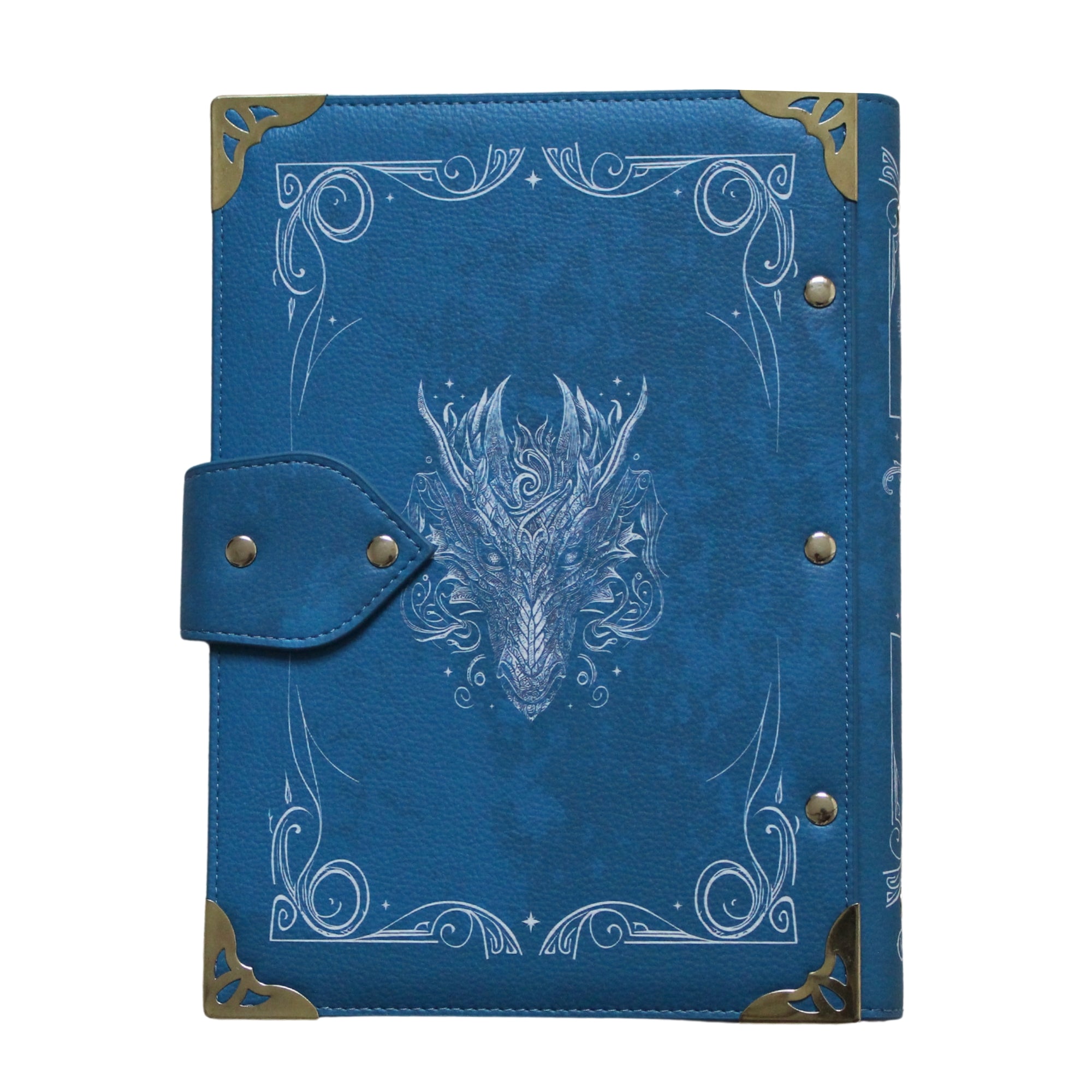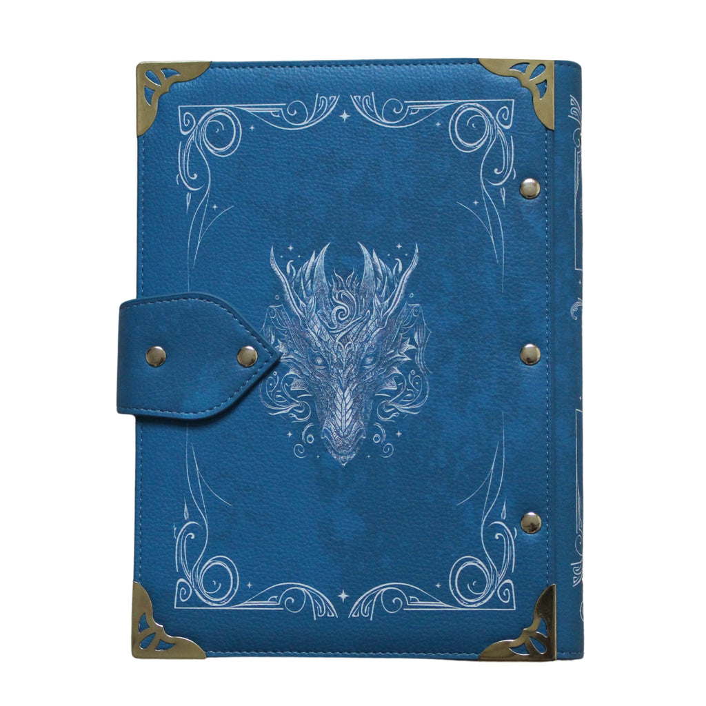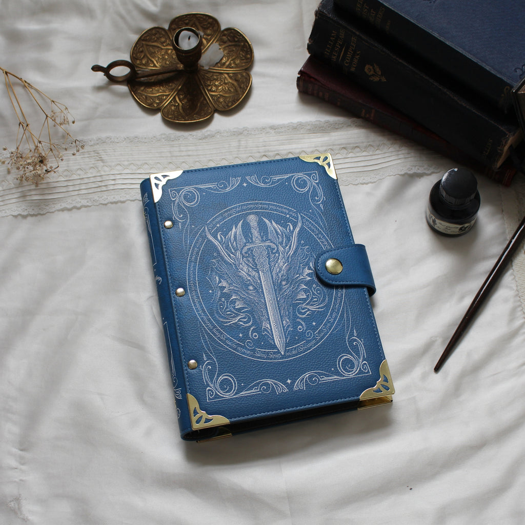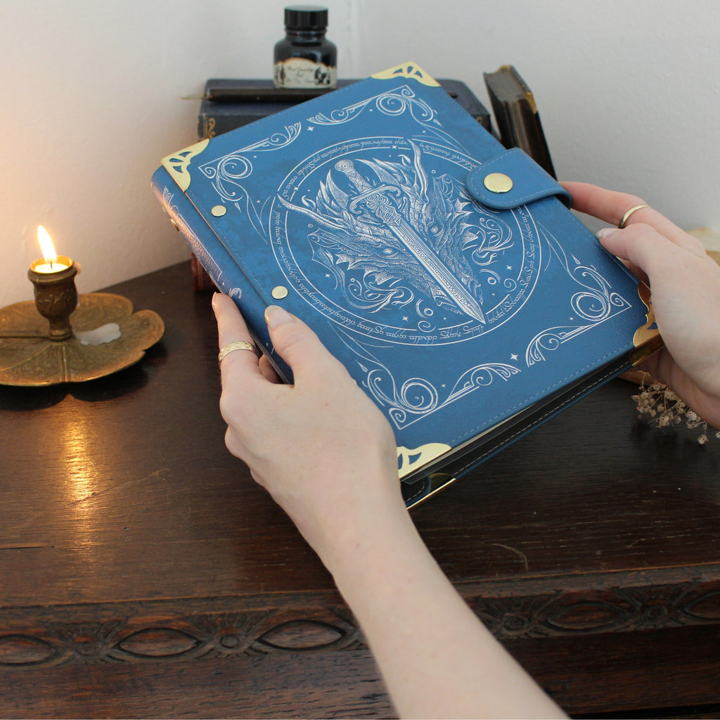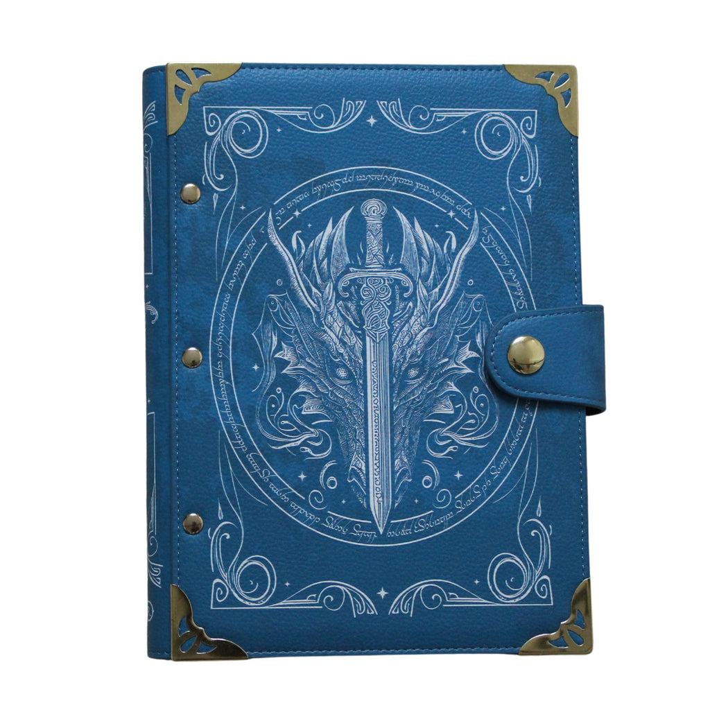 Embark on an epic journey with this exquisitely crafted faux-leather ring bound notebook inspired by the enchanting world of elves and dragons. The stunning blue design features intricate white detailing, with a majestic dragon's head at its centre accompanied by a vertically positioned sword. A circular border inscribed with magical script surrounds the dragon and sword, adding mystique to every page. The back showcases a delicate, smaller-scale depiction of the dragon. Add a touch of fantasy enchantment to your daily note-taking!