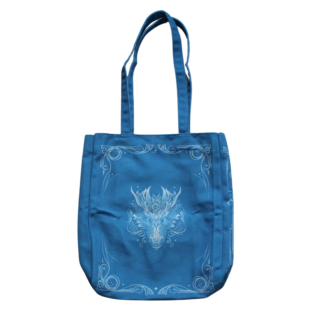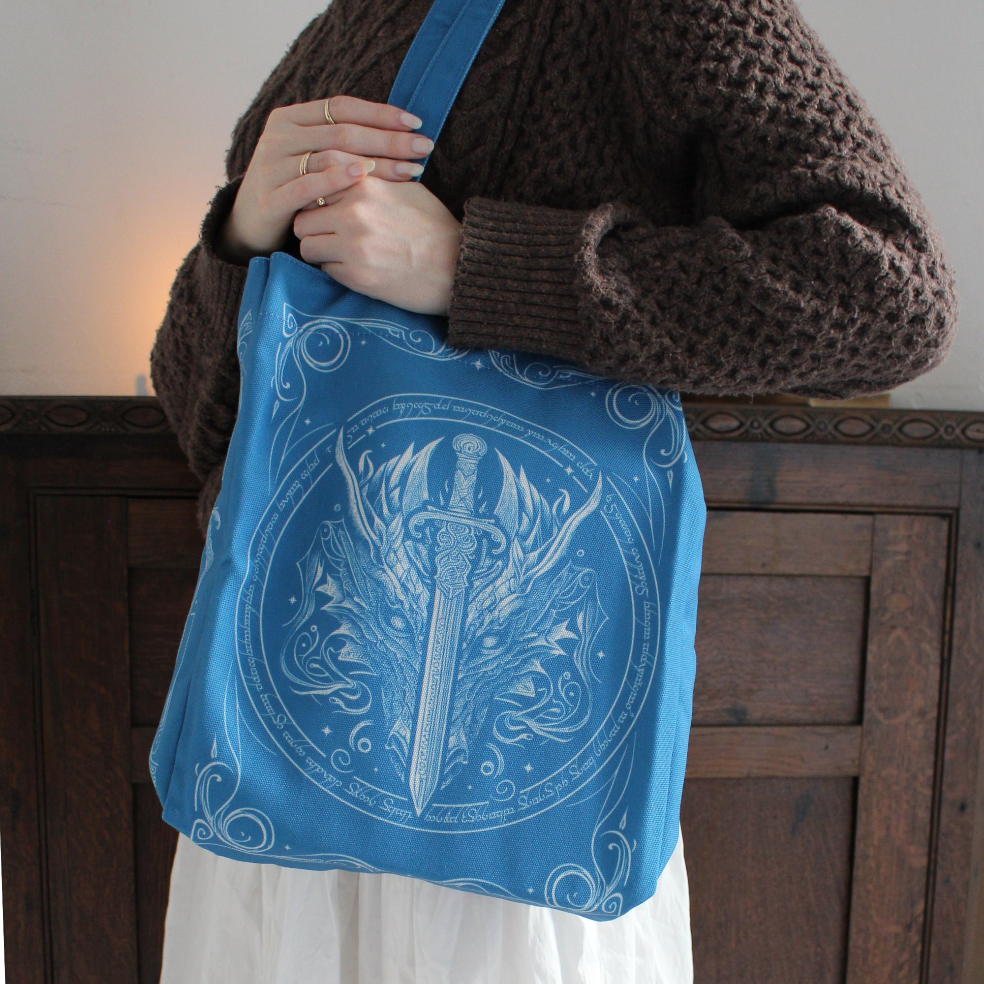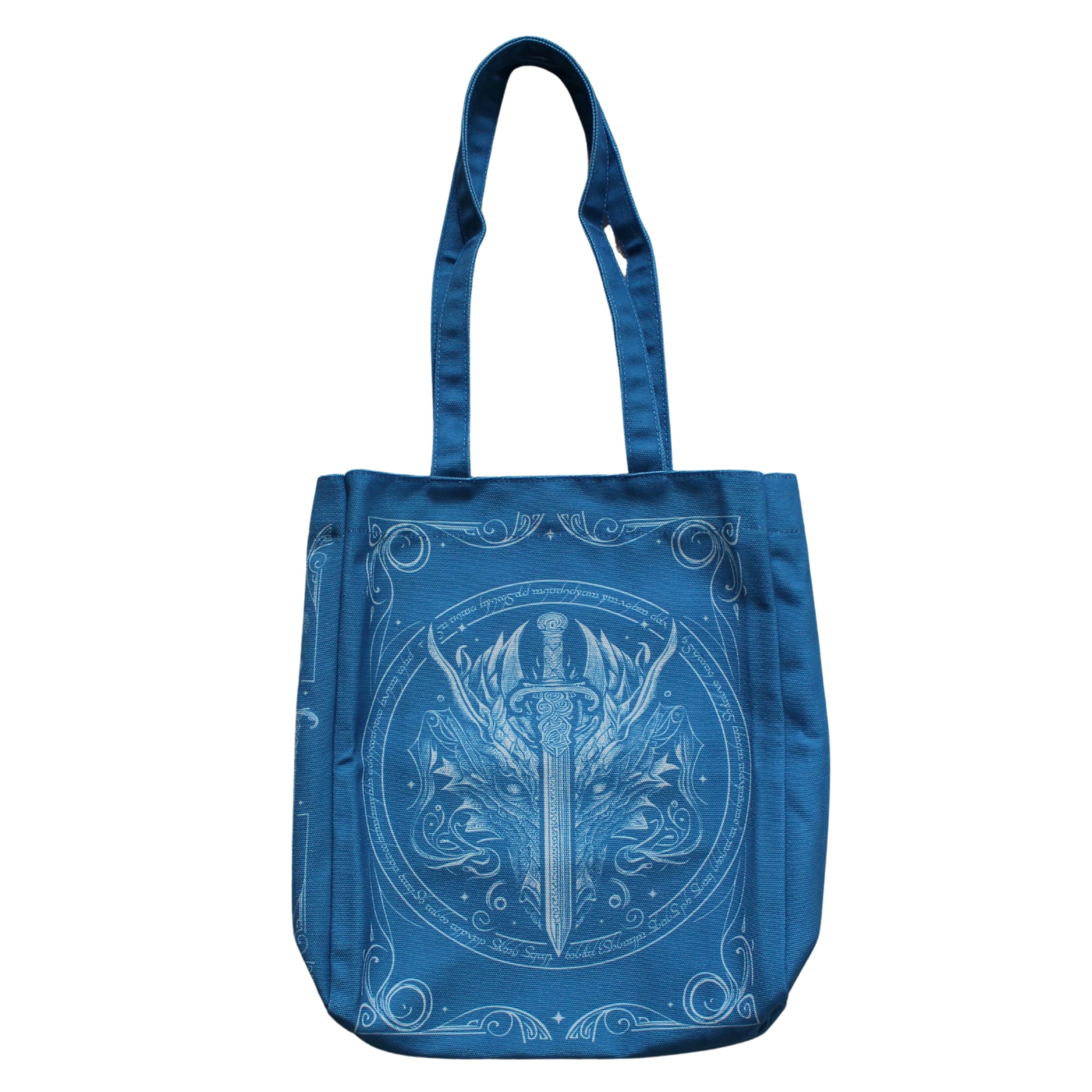 Embrace the enchantment of the fantasy world with this exquisite The Dragon Sword Chronicles tote bag. Inspired by the alluring realm of elves and dragons, the design features a stunning blue backdrop with intricate white designs and a detailed dragon's head accompanied by a vertically positioned sword at its centre. A circular border inscribed with magical script surrounds the dragon and sword, enhancing its captivating charm. The back reveals a delicate, smaller-scale depiction of the dragon, adding to its mystical allure. Perfect for carrying all your daily necessities, from groceries to textbooks, this tote bag is both durable and practical, with an extra inner pocket for your small items and a magnetic clasp for the main compartment. Whether attending a fantasy gathering or going about your daily routine, this bag is sure to infuse a touch of enchantment into your outfit.