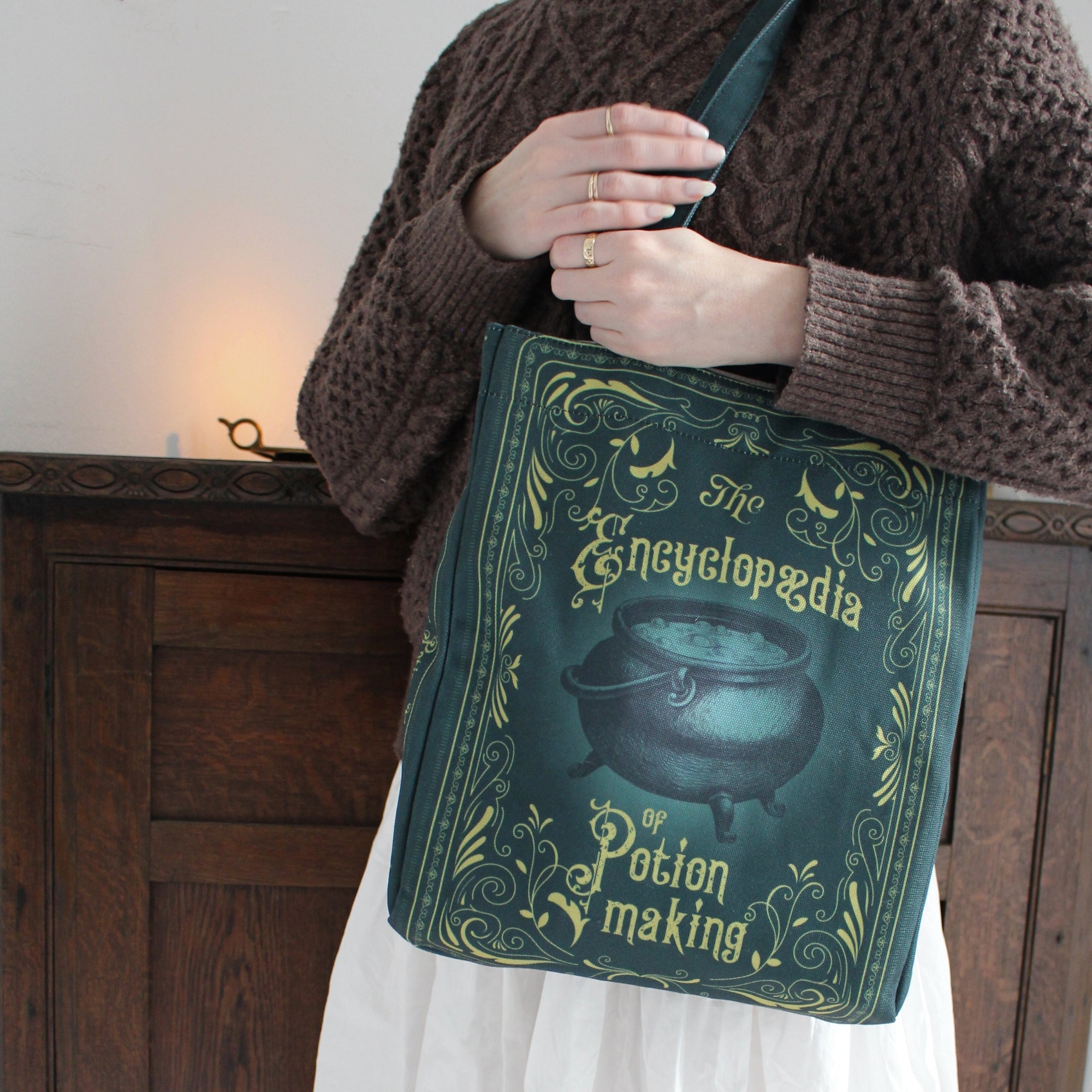 Perfect for carrying all your daily necessities, from groceries to textbooks, this tote bag is sure to make you stand out! This handy tote bag depicts The Encyclopedia of Potion Making, featuring ornate gold detailing on a dark green background with a central illustration of a cauldron. The corners are adorned with gold metal protectors, enhancing its antique charm. The design perfectly captures the old-world, magical essence of potion making. It is a durable and useful design with an extra inner pocket for your small items and a magnetic clasp for the main compartment. The back of the bag features an illustration of a potion vessel bottle, adding to its apothecary allure. Whether attending a magical gathering or going about your daily routine, this bag is sure to infuse a touch of magic into your outfit.