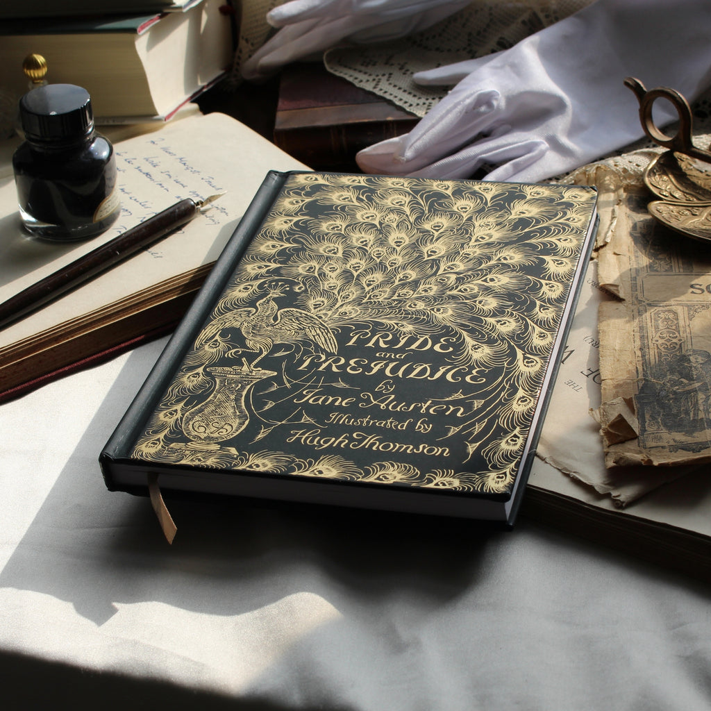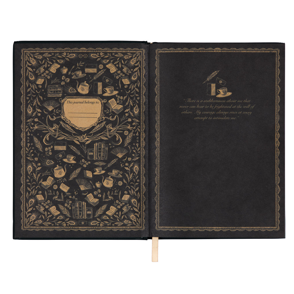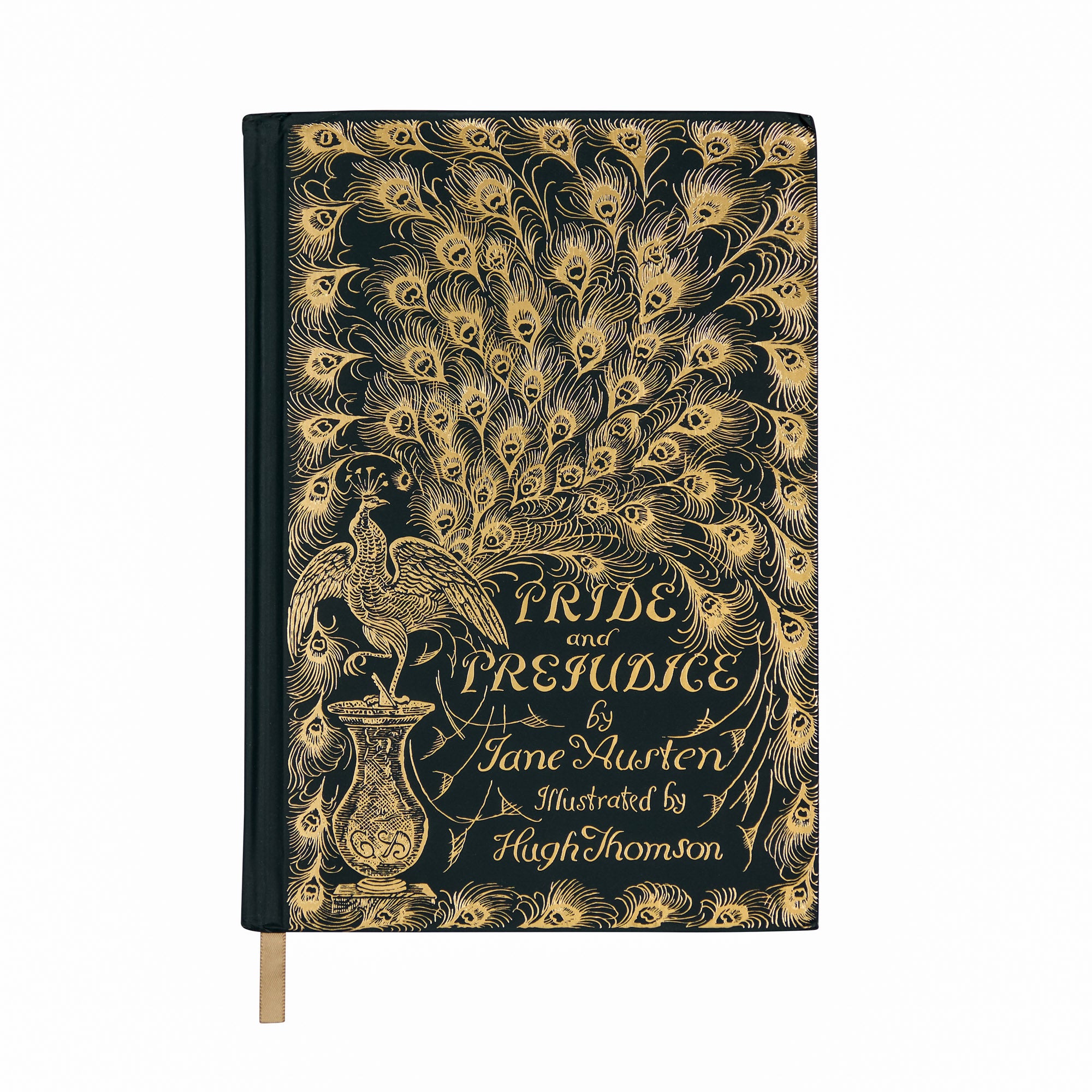 Celebrate your love of Jane Austen’s Pride and Prejudice with this elegant A5 hardback gold-foiled notebook. It features the original 1813 cover artwork by Hugh Thomson, recreated in luminous gold foil. Inside, the opening pages are adorned with a delicate Regency-themed pattern inspired by the illustration—teacups, fans, books, and peacock feathers—subtle enough for everyday notes yet rich with literary charm.