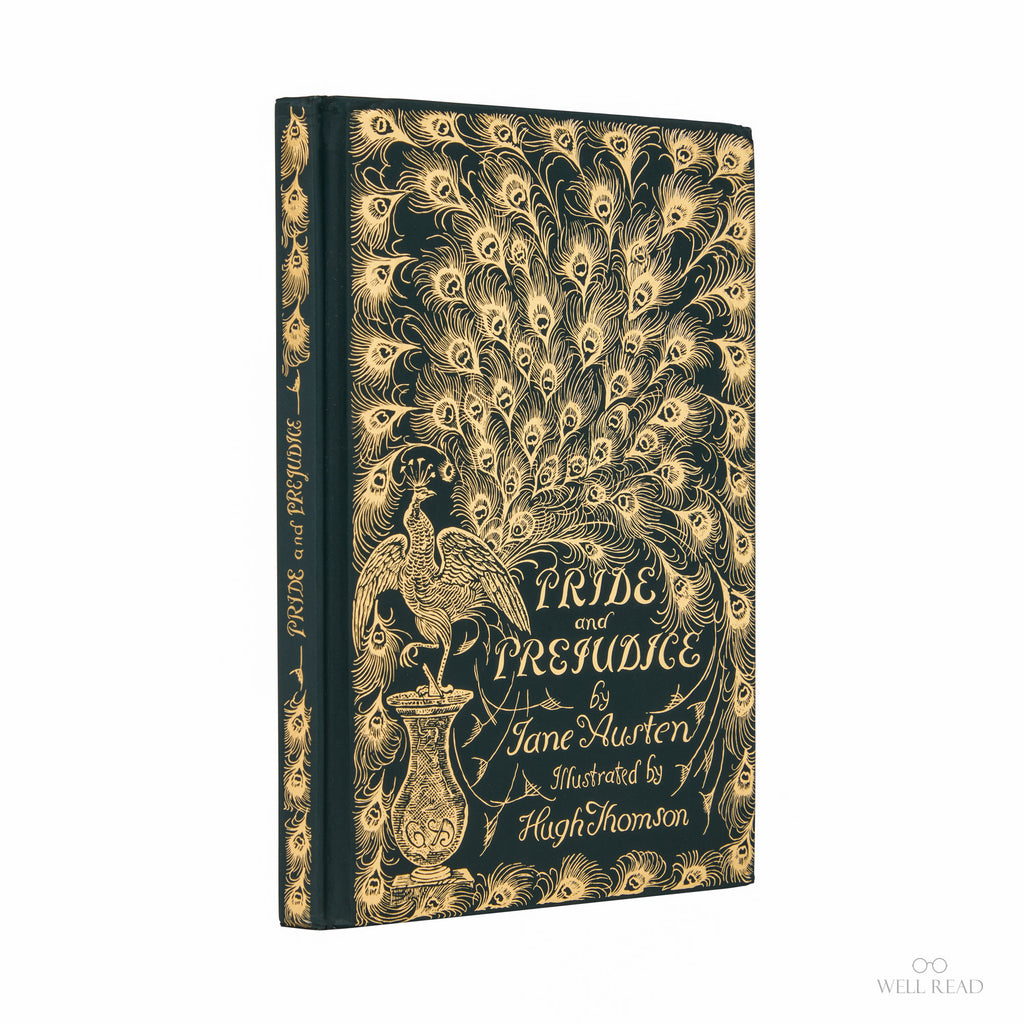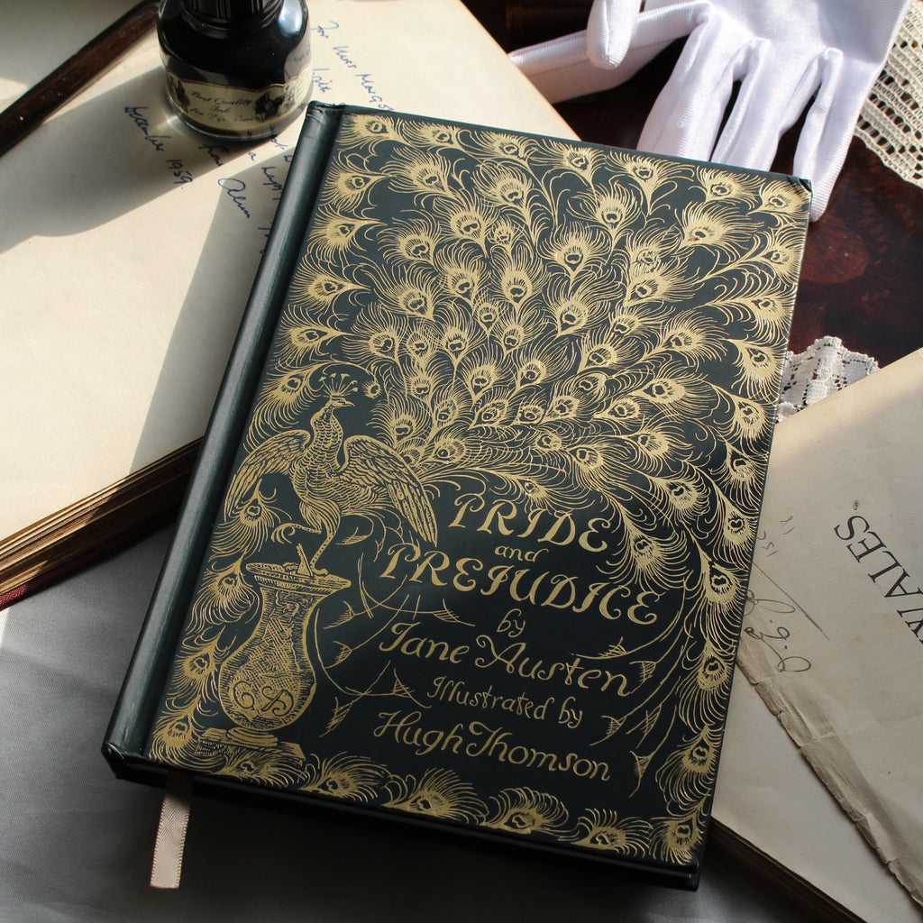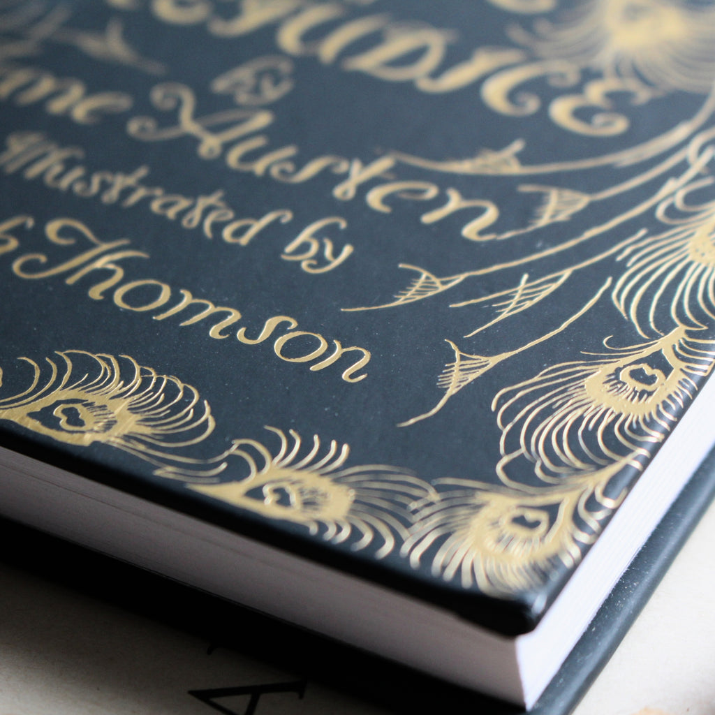 Celebrate your love of Jane Austen’s Pride and Prejudice with this elegant A5 hardback gold-foiled notebook. It features the original 1813 cover artwork by Hugh Thomson, recreated in luminous gold foil. Inside, the opening pages are adorned with a delicate Regency-themed pattern inspired by the illustration—teacups, fans, books, and peacock feathers—subtle enough for everyday notes yet rich with literary charm.