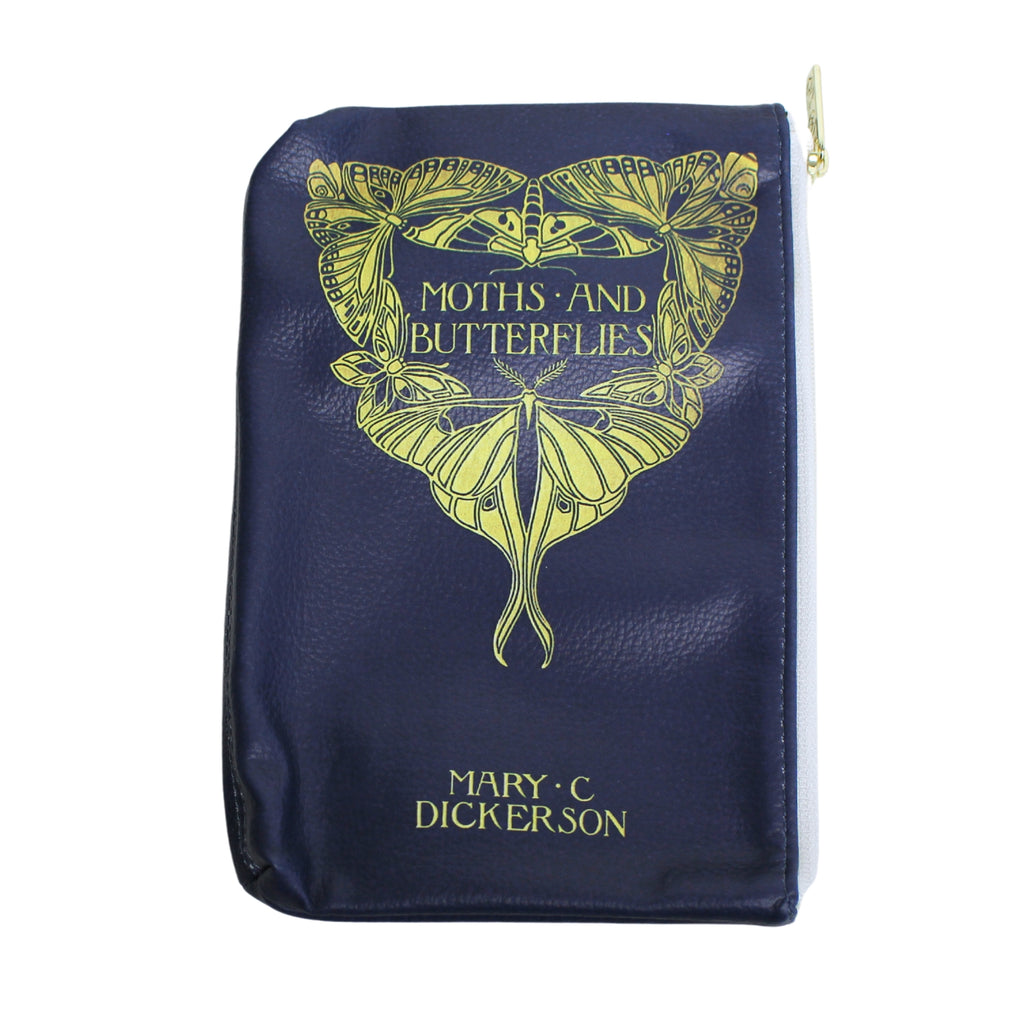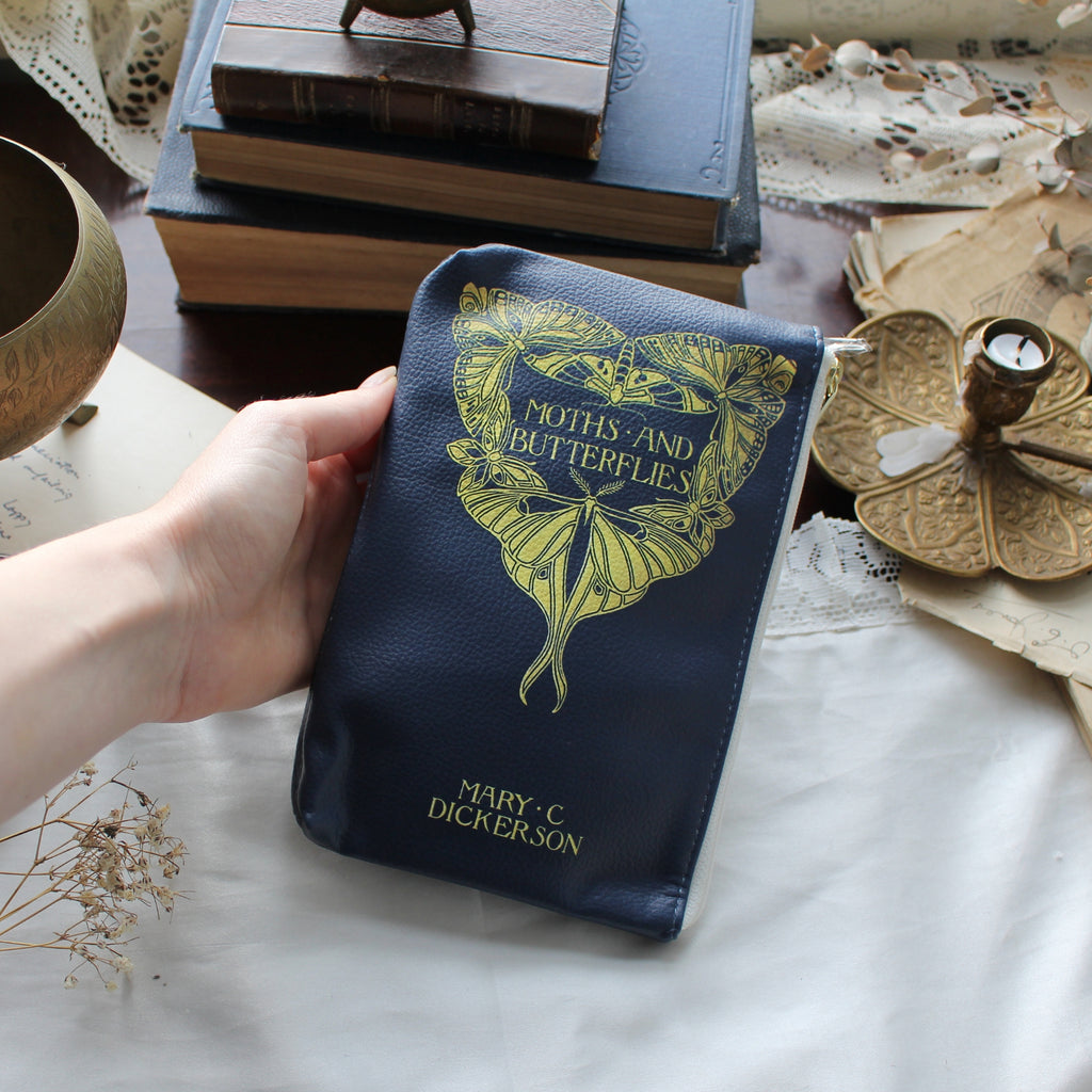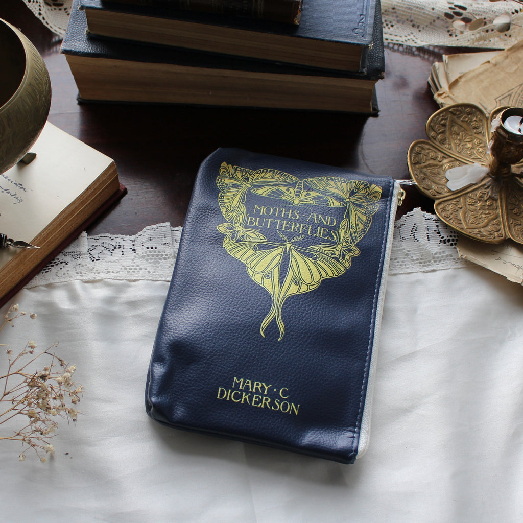 Celebrate the beauty of the natural world with this striking Moths and Butterflies vegan leather pouch purse. Inspired by Mary C. Dickerson's book Moths and Butterflies, published in the early 20th century, this pouch features a beautiful gold butterfly design against a navy faux leather backdrop. Dickerson was a prominent naturalist known for her contributions to the study of reptiles and amphibians, and this book is notable for its detailed study of moths and butterflies, blending scientific rigour with accessibility for the general public. The back is adorned with a miniature butterfly motif, adding to its elegant appeal.