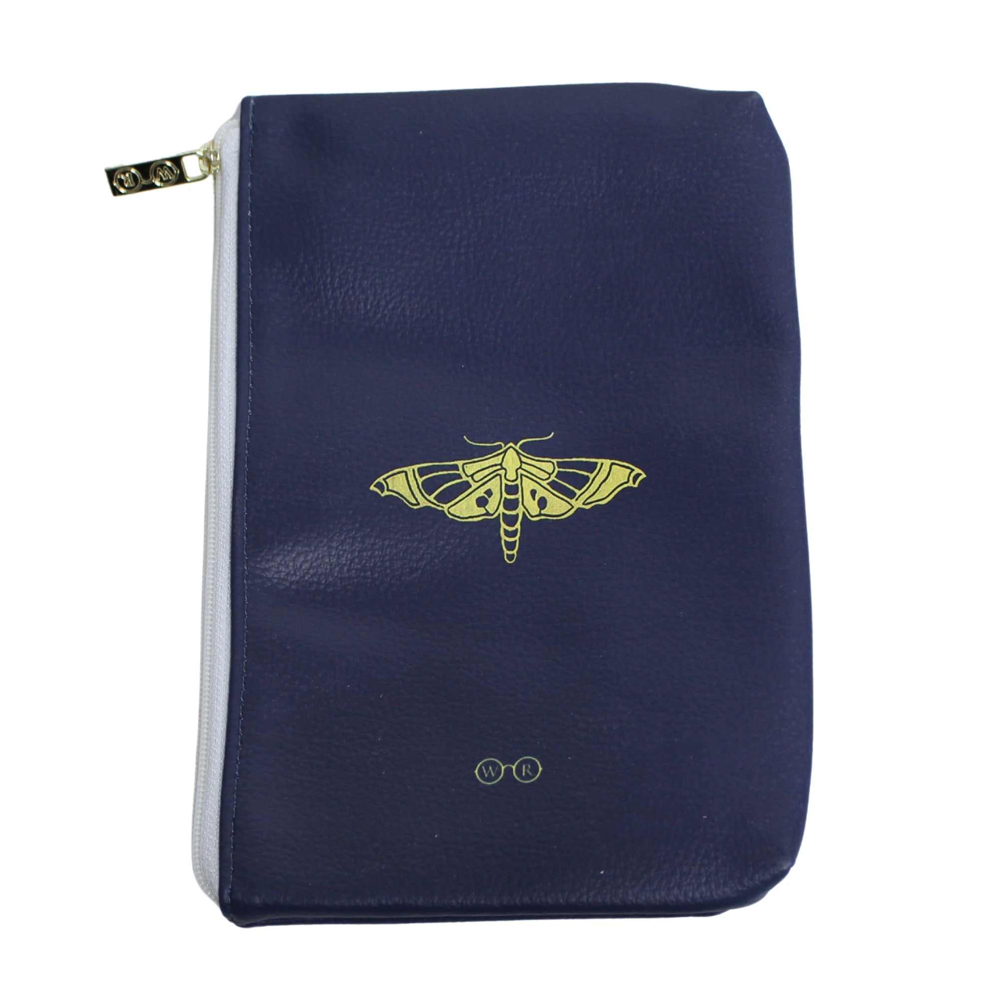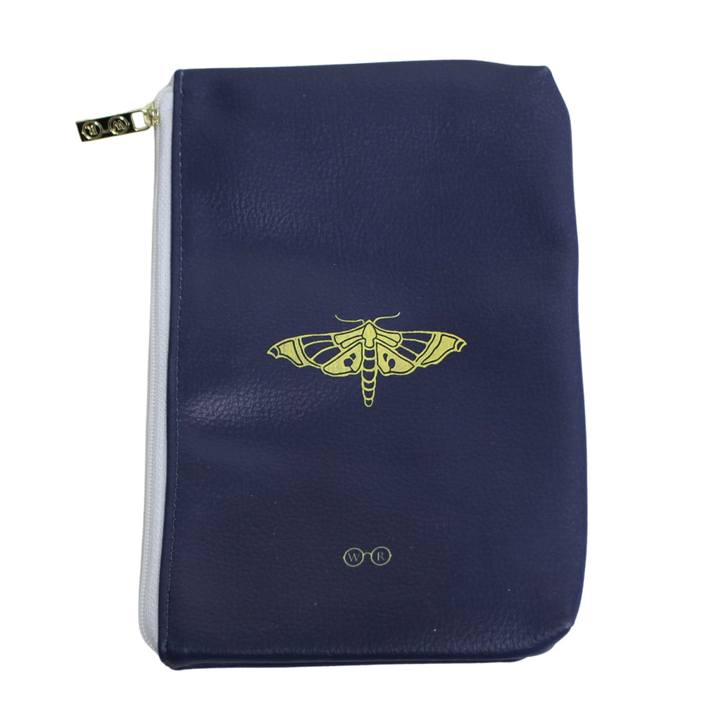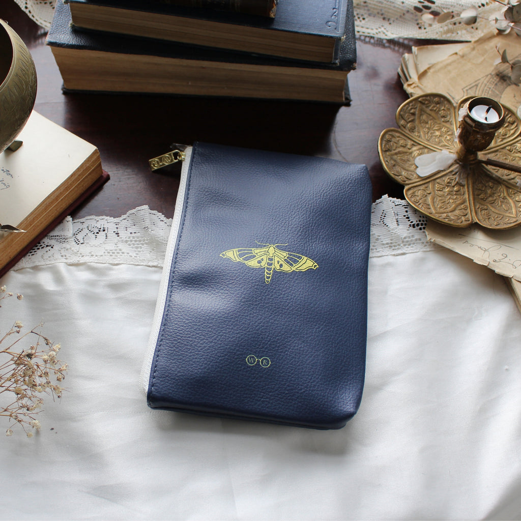 Celebrate the beauty of the natural world with this striking Moths and Butterflies vegan leather pouch purse. Inspired by Mary C. Dickerson's book Moths and Butterflies, published in the early 20th century, this pouch features a beautiful gold butterfly design against a navy faux leather backdrop. Dickerson was a prominent naturalist known for her contributions to the study of reptiles and amphibians, and this book is notable for its detailed study of moths and butterflies, blending scientific rigour with accessibility for the general public. The back is adorned with a miniature butterfly motif, adding to its elegant appeal.